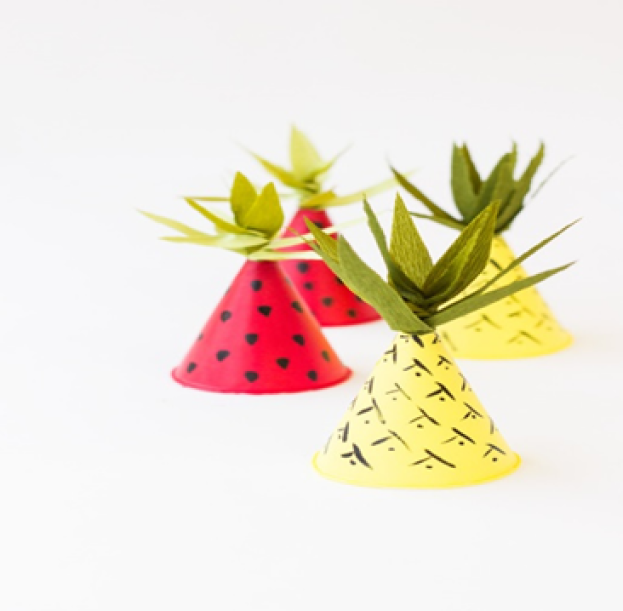 For the strawberry leaves, you’ll want to pull the outer leaves out as far as you can so they are almost “horizontal.” For the pineapple leaves, just pull each leaf out slightly so they are more upright. Slide the base of the leaves into the top of the hat. Depending on how snug they fit, you can opt to add a piece of tape inside the hat to secure them, or they may just stay put on their own!